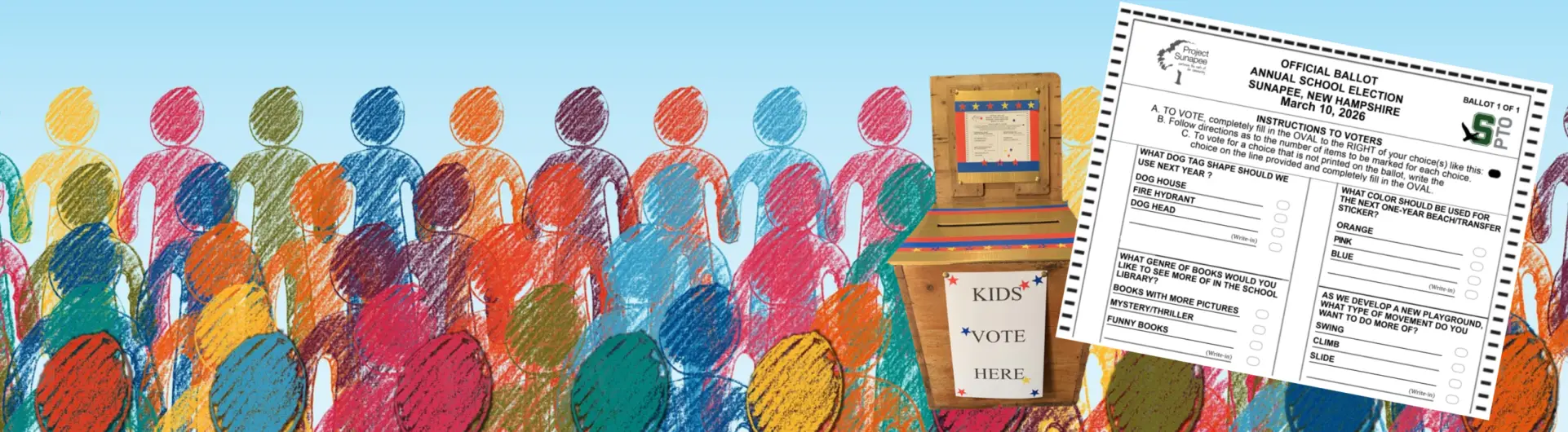 The results are done in partnership with the SPTO and Project Sunapee. The majority of votes for the shape of the dog tag was dog head, and the majority of votes for the color of the beach/transfer station sticker was blue. The majority of students who voted want to see more funny books in the library, and more climbing on our new playground.